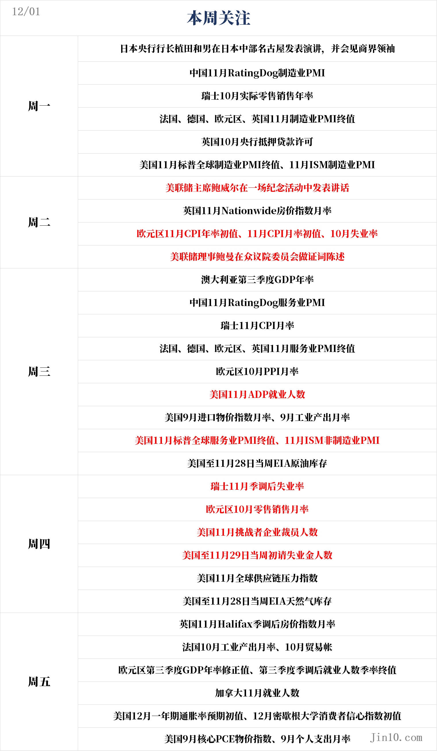 对于下周,美联储将进入12月会议前的惯例“噤声期”,而诸多经济数据即将公布,此外,随着大型交易员休假归来,下周市场可能波动剧烈。
