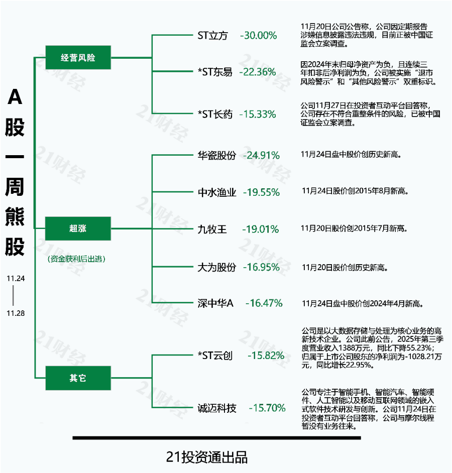 本期十大熊股中,ST立方(300344.SZ)以30.00%的跌幅成为本期的最熊股。华瓷股份(001216.SZ)、*ST东易(002713.SZ)、中水渔业(000798.SZ)、九牧王(601566.SH)等股的周跌幅均在15%以上。