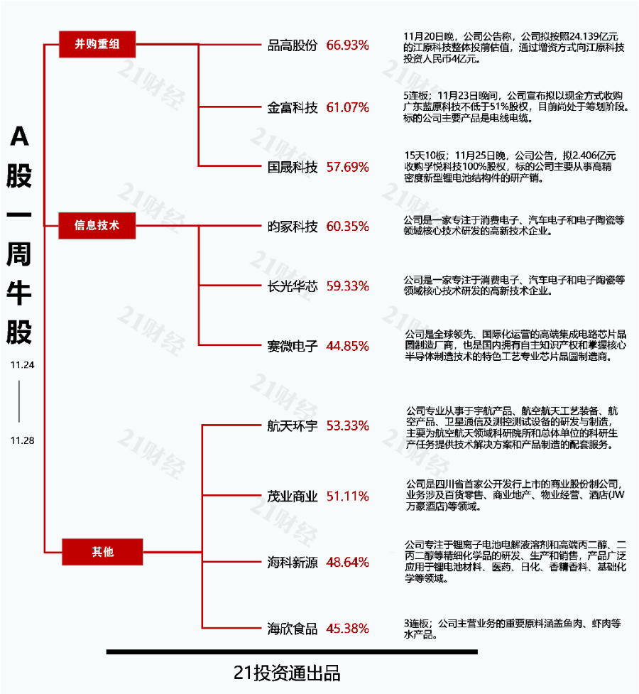 本期牛股榜中,品高股份(688227.SH)以66.93%的周涨幅夺魁,金富科技(003018.SZ)以61.07%的涨幅位居第二,昀冢科技(688670.SH)、长光华芯(688048.SH)、国晟科技(603778.SH)、航天环宇(688523.SH)周涨幅超53%。本期牛股榜十只个股过去一周累计涨幅均超过44%。
