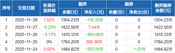 融资方面,当日融资买入252.82万元,融资偿还371.15万元,融资净偿还118.33万元。融券方面,融券卖出0份,融券偿还0份,融券余量0份,融券余额0元。融资融券余额合计1304.23万元。