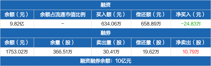 融资方面,当日融资买入634.06万元,融资偿还658.89万元,融资净偿还24.83万元,连续3日净偿还累计2800.8万元。融券方面,融券卖出30.41万份,融券偿还19.62万份,融券余量366.51万份,融券余额1753.02万元。融资融券余额合计10亿元。