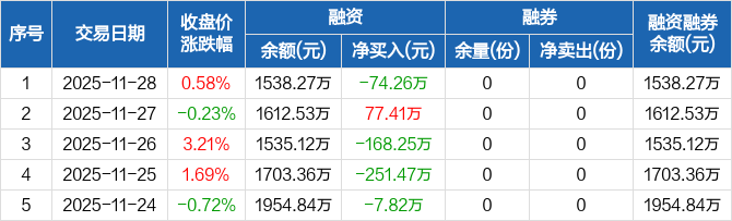 融资方面,当日融资买入70.7万元,融资偿还144.97万元,融资净偿还74.26万元。融券方面,融券卖出0份,融券偿还0份,融券余量0份,融券余额0元。融资融券余额合计1538.27万元。