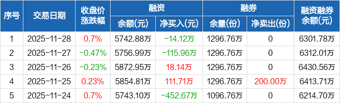 融资方面,当日融资买入262.73万元,融资偿还276.85万元,融资净偿还14.12万元。融券方面,融券卖出0份,融券偿还0份,融券余量1296.76万份,融券余额558.9万元。融资融券余额合计6301.78万元。