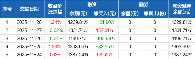 融资方面,当日融资买入164.01万元,融资偿还265.91万元,融资净偿还101.9万元。融券方面,融券卖出0份,融券偿还0份,融券余量0份,融券余额0元。融资融券余额合计1229.81万元。