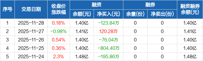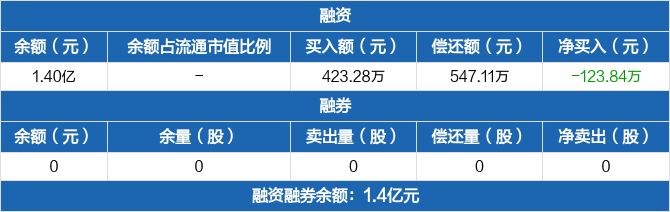 融资方面,当日融资买入423.28万元,融资偿还547.11万元,融资净偿还123.84万元。融券方面,融券卖出0份,融券偿还0份,融券余量0份,融券余额0元。融资融券余额合计1.4亿元。