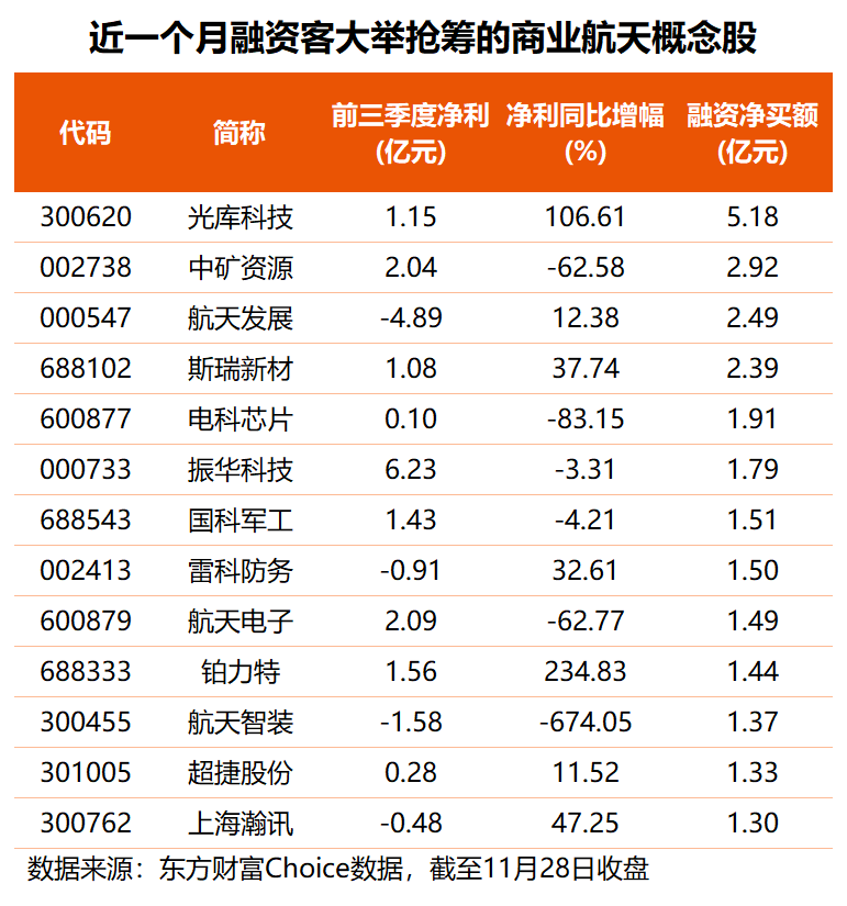 其中,光库科技获融资客抢筹5.18亿元,公司前三季度净利同比增逾一倍。中矿资源融资净买额近3亿元,航天发展、斯瑞新材均有逾2亿元融资净买入,雷科防务、航天电子、航天智装等14股融资净买额在1亿至2亿元之间。