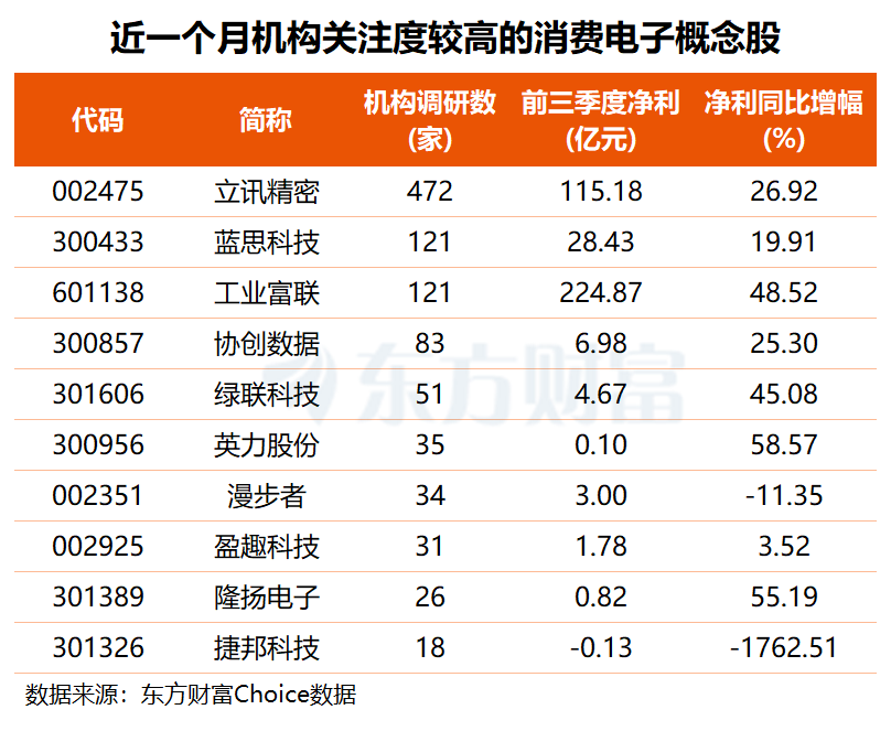 东方财富Choice数据显示,近一个月以来,多只消费电子概念股获机构密集调研,其中,龙头股立讯精密获472家机构集中调研,蓝思科技、工业富联均获121家机构调研。