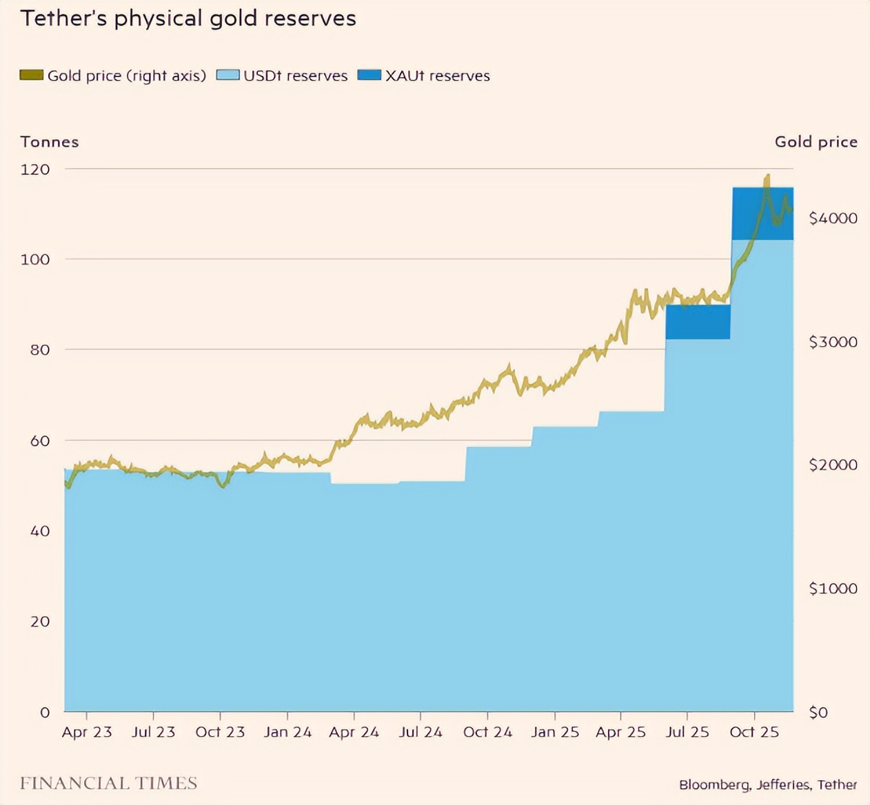 加密巨头Tether成黄金市场新势力,黄金购买量一度超过央行。今年推动金价屡创新高的关键买家,也有加密货币世界中最具争议的稳定币发行商Tether。据媒体周四报道,投资银行Jefferies测算显示,截至9月30日,全球最大稳定币USDT的发行商Tether持有116吨黄金,价值约140亿美元,使其成为除主要央行外最大的单一黄金持有者,持有量与韩国、匈牙利或希腊等国的官方储备相当。仅在第三季度,Tether购入约26吨黄金,占当期全球黄金总需求的2%,相当于已知央行购买量的12%。今年金价在两波上涨中累计上涨约2000美元,第二波涨势恰与Tether购金提速同步。Jefferies指出,Tether的需求“可能在短期内收紧了供应并影响市场情绪,进而驱动投机资金流入”。