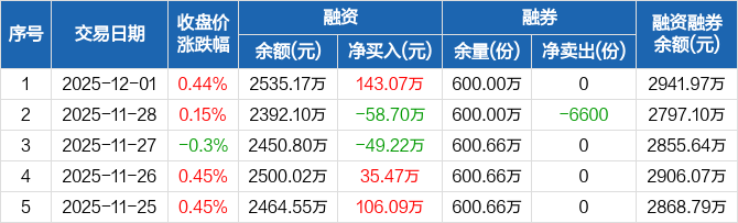 融资方面,当日融资买入261.22万元,融资偿还118.14万元,融资净买入143.07万元。融券方面,融券卖出0份,融券偿还0份,融券余量600万份,融券余额406.8万元。融资融券余额合计2941.97万元。