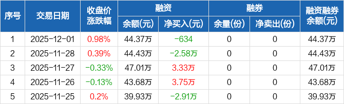 融资方面,当日融资买入7万元,融资偿还7.07万元,融资净偿还634元。融券方面,融券卖出0份,融券偿还0份,融券余量0份,融券余额0元。融资融券余额合计44.37万元。