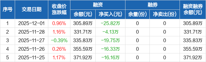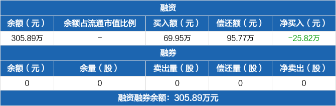 融资方面,当日融资买入69.95万元,融资偿还95.77万元,融资净偿还25.82万元,连续5日净偿还累计82.19万元。融券方面,融券卖出0份,融券偿还0份,融券余量0份,融券余额0元。融资融券余额合计305.89万元。