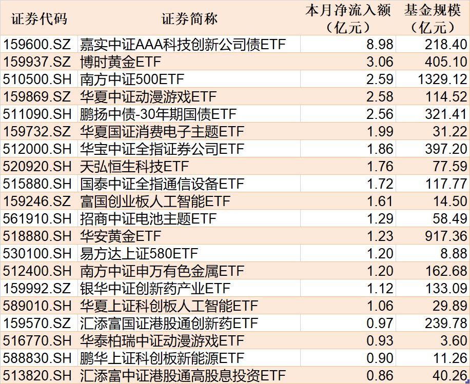 Wind数据显示,在12月1日的非货币ETF市场中,嘉实中证AAA科技创新公司债ETF基金份额增加0.09亿份,实现净流入8.98亿元;博时黄金ETF份额增加0.33亿份,对应净流入3.06亿元;南方中证500ETF份额增加0.36亿份,带来净流入2.59亿元。