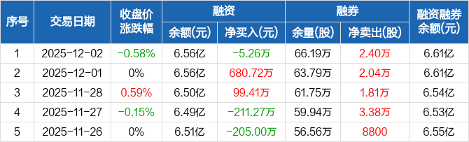 融资方面,当日融资买入584.43万元,融资偿还589.7万元,融资净偿还5.26万元。融券方面,融券卖出2.56万股,融券偿还1600股,融券余量66.19万股,融券余额451.42万元。融资融券余额合计6.61亿元。