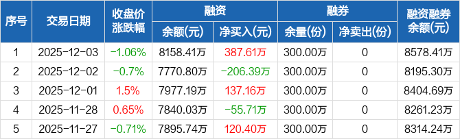 融资方面,当日融资买入1245.11万元,融资偿还857.5万元,融资净买入387.61万元。融券方面,融券卖出0份,融券偿还0份,融券余量300万份,融券余额420万元。融资融券余额合计8578.41万元。