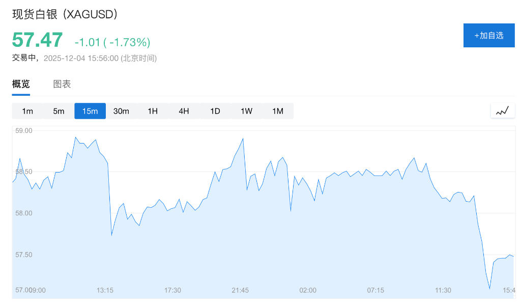 现货白银高位跳水后反弹,现跌超1.7%至57.47美元/盎司。但由于市场普遍预期美联储将降息,白银在历史高位附近徘徊。