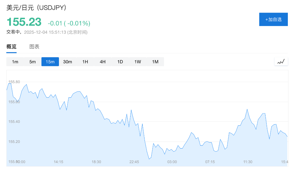 日元兑美元短线走高。据华尔街见闻,日本央行或与12月加息,政府或将容忍此举,市场的焦点正从“是否加息”转向“还将加息多少”。