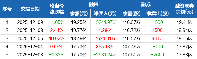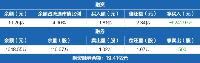 融资方面,当日融资买入1.81亿元,融资偿还2.34亿元,融资净偿还5241.97万元。融券方面,融券卖出1.02万股,融券偿还1.07万股,融券余量116.67万股,融券余额1648.55万元。融资融券余额合计19.41亿元。