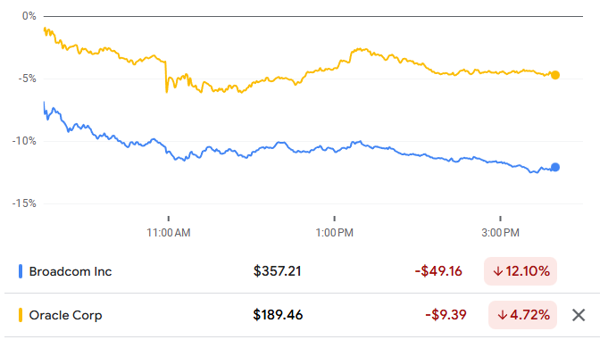 12月10日甲骨文财报显示,支出增长远超分析师预期且将持续,甲骨文股价持续下跌。另一个AI紧张情绪的信号是,芯片制造商博通AI订单数据令人失望,周五股价暴跌11%。