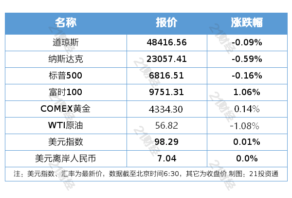 纽约股市三大股指12月15日下跌。截至当天收盘,道琼斯工业平均指数比前一交易日下跌41.49点,收于48416.56点,跌幅为0.09%;标准普尔500种股票指数下跌10.90点,收于6816.51点,跌幅为0.16%;纳斯达克综合指数下跌137.76点,收于23057.41点,跌幅为0.59%。