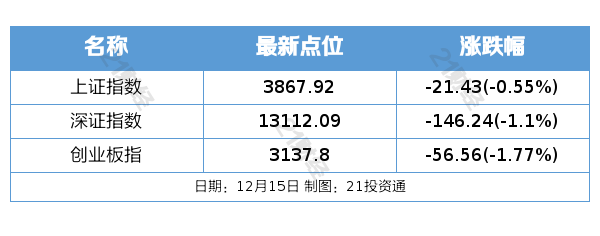 12月15日,市场震荡调整,沪指盘中翻红后再度回落,创业板指低开低走。截至收盘,沪指跌0.55%,深成指跌1.1%,创业板指跌1.77%。沪深两市成交额1.77万亿,较上一个交易日缩量3188亿。