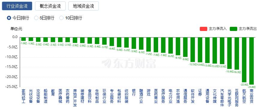 净流出方面,商业百货、航天航空、互联网服务等净流出排名靠前,其中商业百货净流出23.80亿元。