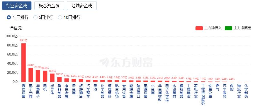 行业资金方面,截至收盘,通信设备、电子元件、消费电子等净流入排名靠前,其中通信设备净流入85.05亿。