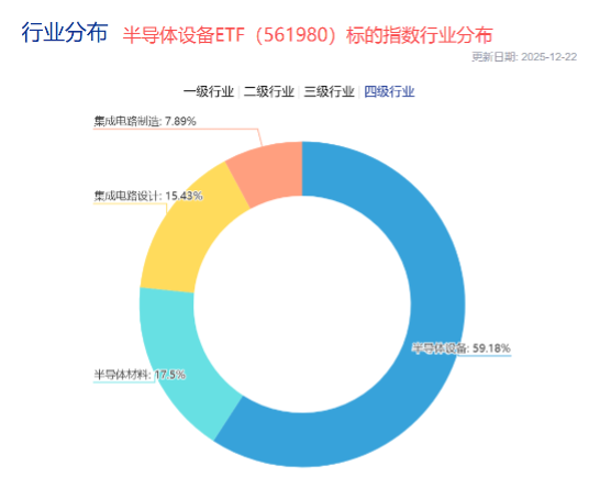 据了解,半导体设备ETF(561980)跟踪中证半导体,标的指数中“设备”含量近60%,半导体设备+材料+集成电路设计三行业占比超90%,均为芯片产业链中/上游的“卖铲子”领域,国产自主可控广阔。重仓方面,指数重点布局中微公司、北方华创、寒武纪、中芯国际、海光信息等细分龙头,前十大集中度近8成,高弹性特征较为显著。