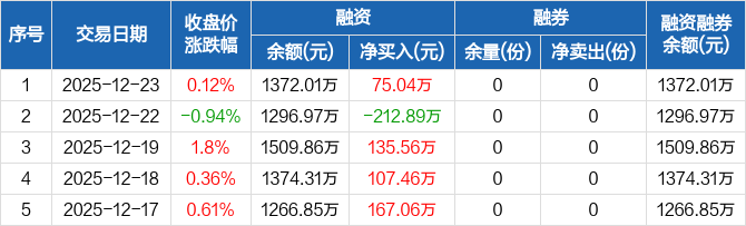 融资方面,当日融资买入400.09万元,融资偿还325.05万元,融资净买入75.04万元。融券方面,融券卖出0份,融券偿还0份,融券余量0份,融券余额0元。融资融券余额合计1372.01万元。