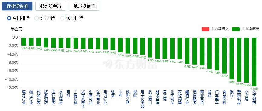净流出方面,化学制药、小金属、塑料制品等净流出排名靠前,其中化学制药净流出11.55亿元。