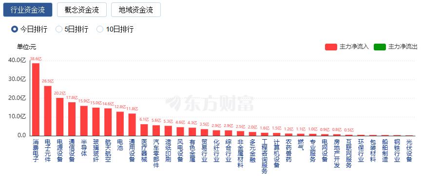 行业资金方面,截至收盘,消费电子、电子元件、电源设备等净流入排名靠前,其中消费电子净流入38.60亿。
