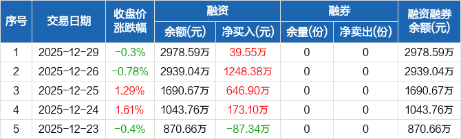 融资方面,当日融资买入181.99万元,融资偿还142.44万元,融资净买入39.55万元,连续4日净买入累计2107.93万元。融券方面,融券卖出0份,融券偿还0份,融券余量0份,融券余额0元。融资融券余额合计2978.59万元。