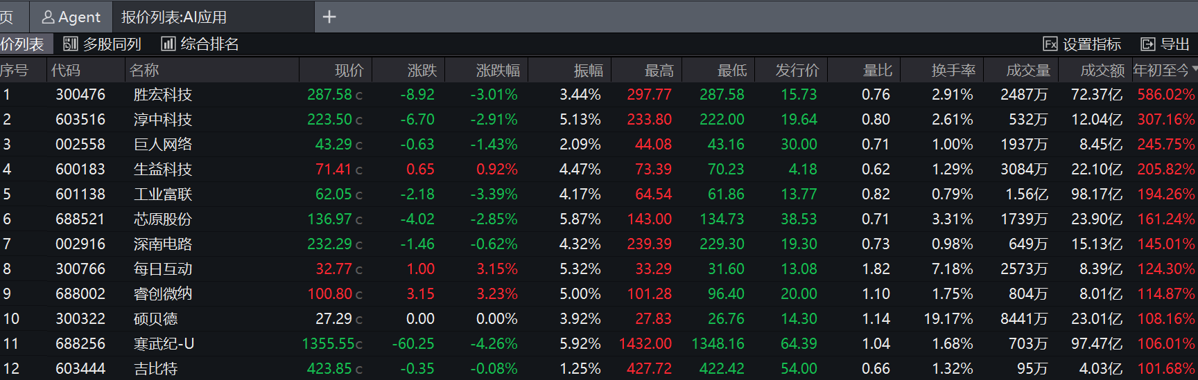 在12家股价翻倍的AI应用指数成份股中,有4家涨幅超过200%。其中,胜宏科技全年涨幅居首,达到586.02%;淳中科技(603516.SH)紧随其后,全年涨幅307.18%;巨人网络(002558.SZ)全年涨幅位居第三,为245.75%。