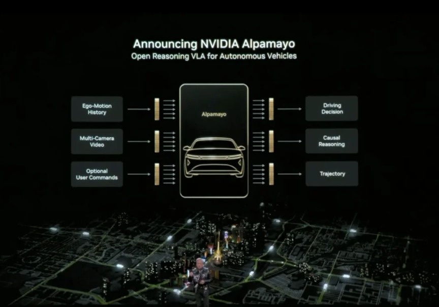 黄仁勋还正式发布了Alpamayo。Alpamayo是一个面向自动驾驶领域的开源工具链,也是首个开源的视觉-语言-行动(VLA)推理模型。与之前仅开源代码不同,英伟达这次开源了从数据到部署的完整开发资源。