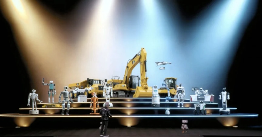 在发布会现场,黄仁勋背后站满了不同形态、不同用途的机器人,它们被集中展示在分层舞台上:从人形机器人、双足与轮式服务机器人,到工业机械臂、工程机械、无人机与手术辅助设备,展现出一版“机器人生态图景”。