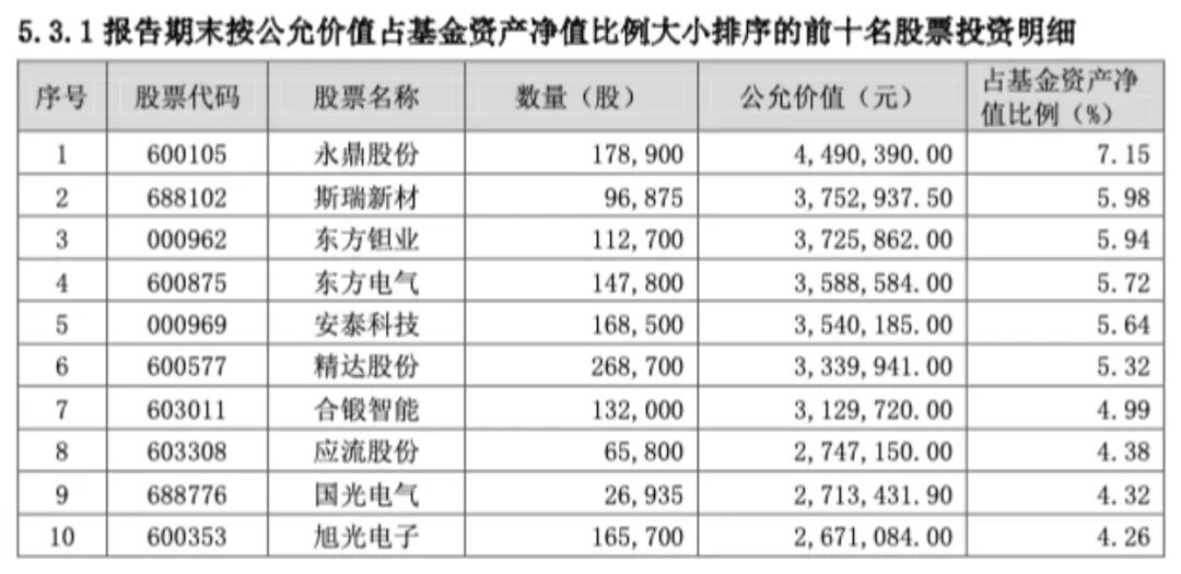 与上季度末相比,前十大重仓股出现一定变化。东方钽业、安泰科技、精达股份、合锻智能、国光电气均获得一定幅度的增持,永鼎股份、旭光电子则小幅减持,斯瑞新材、东方电气、应流股份新进前十大重仓股之列,爱科赛博、皖仪科技、王子新材则退出名单。