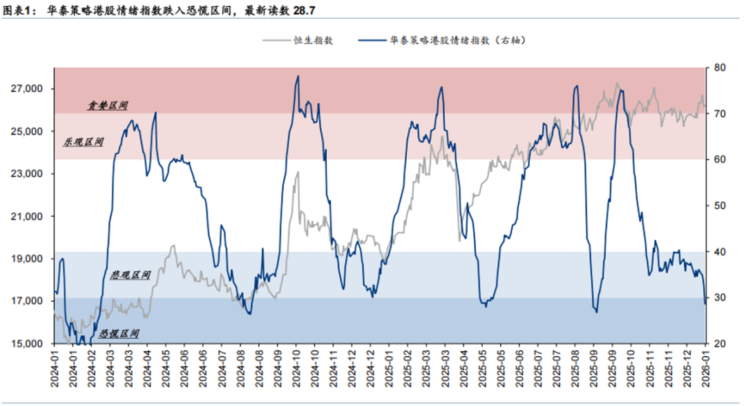 2023年底以来进入“恐慌区间”布局港股未来1个月胜率100%。2026年1月9日,港股情绪指数回落至28.6,时隔四个月再次落入恐慌区间(<30)。2020年至今情绪指数共21次落入恐慌区间,首次进入30天后恒指平均上涨概率76%,平均/中位数上涨幅度均为3%;2023年10月底至今的七次信号胜率更是达到100%,平均恒指上涨幅度4%。若完全参考2023年以来经验,恒指未来1个月在27000点以上,但目前期权市场隐含恒指在1月底、2月底上涨到27000点的概率仅为25%、39%,存在正向预期差。