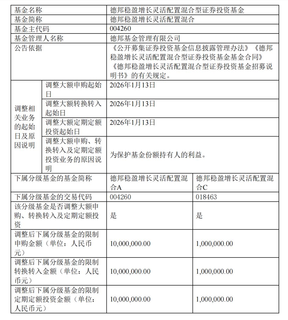 1月13日德邦基金发布公告称,为保护基金份额持有人的利益,从当日开始对德邦稳盈在单一销售机构的大额申购业务限额进行调整。调整期间,单日单个基金账户通过单一销售机构单笔或多笔累计申购(含转换转入及定期定额投资)该基金A份额金额合计超过1000万元、或C份额金额合计超过100万元,基金管理人有权拒绝,但管理人认为相关申请不会影响基金平稳运作的除外。