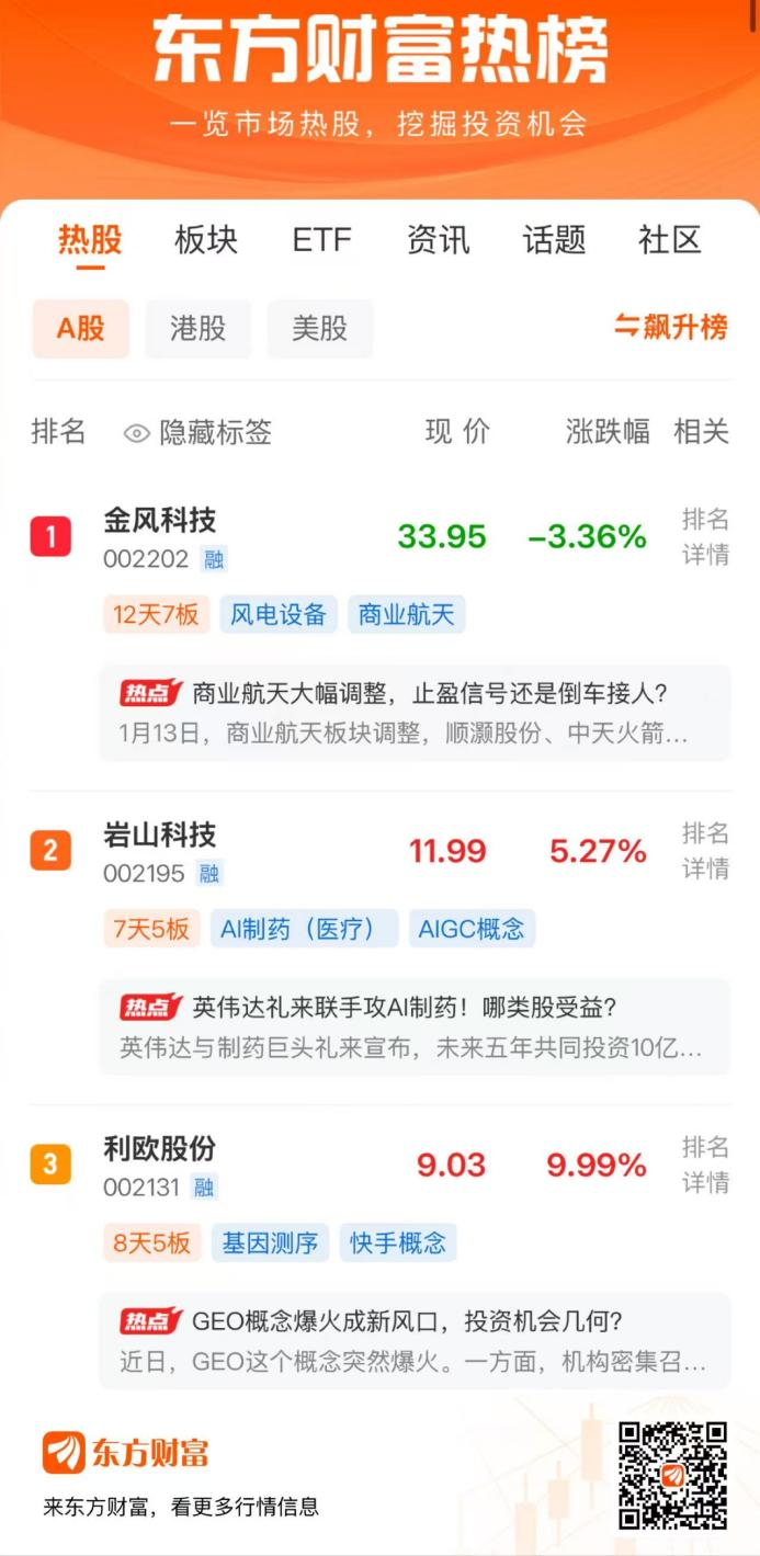 1月13日,两市冲高回落,创业板指领跌。东方财富热榜前三的股票中,金风科技位列第1,岩山科技位列第2,利欧股份位列第3。