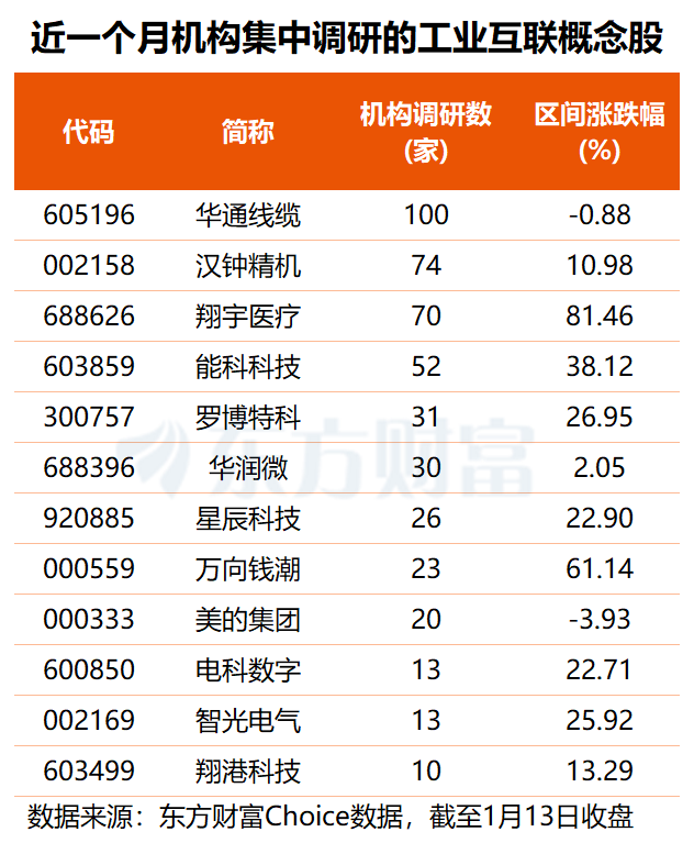 东方财富Choice数据显示,近一个月以来,共有22只工业互联概念股获得机构调研,其中,华通线缆获100家机构扎堆调研,汉钟精机、翔宇医疗的机构调研数分别为74家和70家,能科科技也有52家机构给予关注,罗博特科、星辰科技、美的集团等5股均获超20家机构调研。