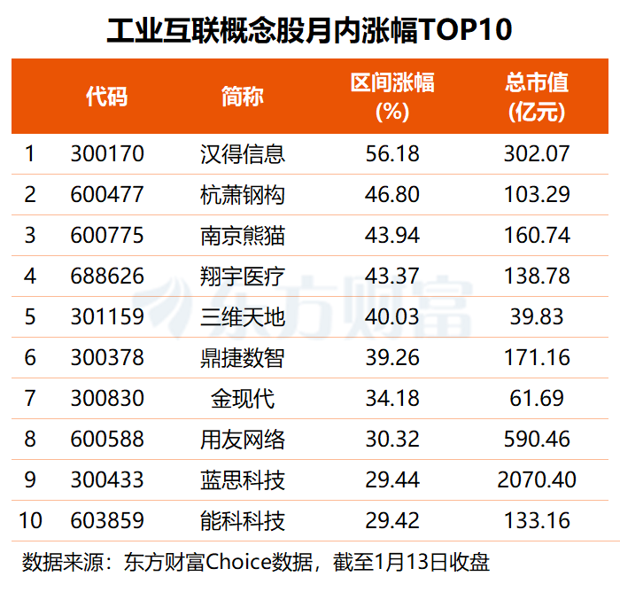 若把时间轴拓宽至2025年初,截至1月13日收盘,工业互联概念板块走出1只五倍股,为云汉芯城,公司累计涨幅高达534.52%;品茗科技、梦天家居区间涨幅分别达434.61%和318.80%;奥美森、万向钱潮、中恒电气、东杰智能等8股累计涨幅均超两倍。