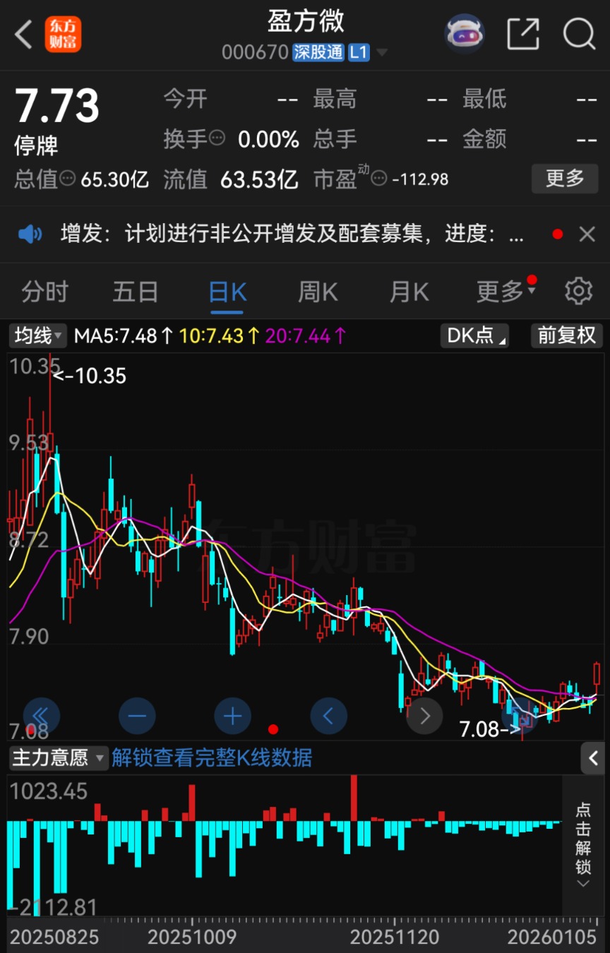 盈方微自1月6日开市起停牌,计划自1月20日开市起复牌。截至1月5日收盘,盈方微股价报7.73元/股,涨幅达4.74%,总市值为65.30亿元。