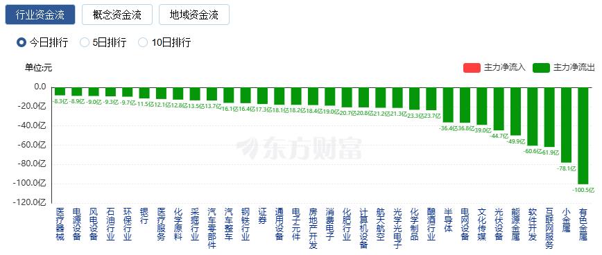净流出方面,有色金属、小金属、互联网服务等净流出排名靠前,其中有色金属净流出100.5亿元。