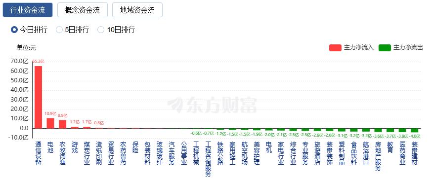 行业资金方面,截至收盘,通信设备、电池、农牧饲渔等净流入排名靠前,其中通信设备净流入65.34亿。