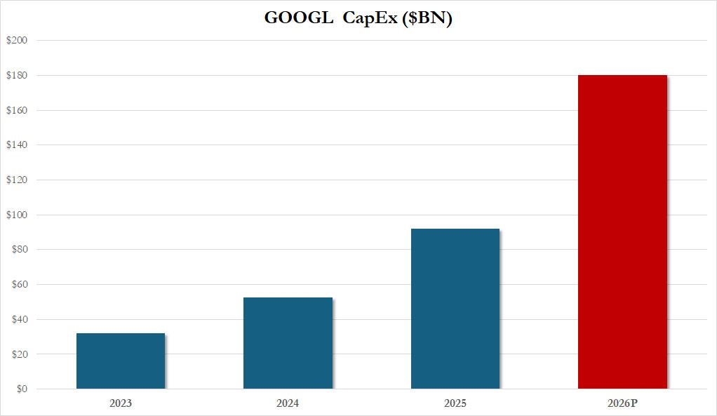 2025年第四季度,Alphabet从营收到EPS利润端的业绩全面优于预期,但公司披露,今年资本支出将达1750亿至1850亿美元,几乎是2025年全年的两倍,令华尔街震惊。