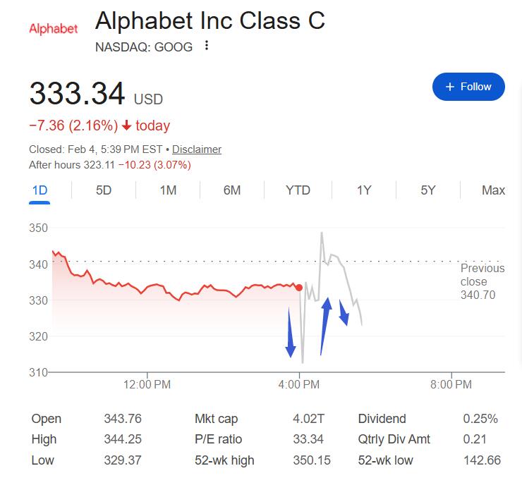 财报发布后,Alphabet股价盘后先跳水,盘后曾跌7.5%,市值瞬间蒸发约3500亿美元,后反弹转涨,盘后一度转涨超4%,市值在数分钟内剧烈波动约8000亿美元,此后又转跌。股价巨震体现出投资者对公司AI战略的矛盾情绪。