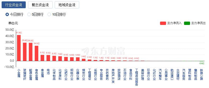 行业资金方面,截至收盘,小金属、玻璃玻纤、能源金属等净流入排名靠前,其中小金属净流入41.87亿。