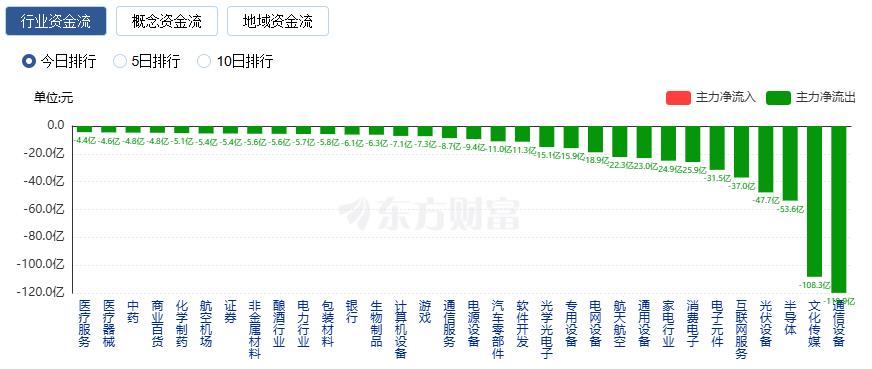 净流出方面,通信设备、文化传媒、半导体等净流出排名靠前,其中通信设备净流出119.9亿元。