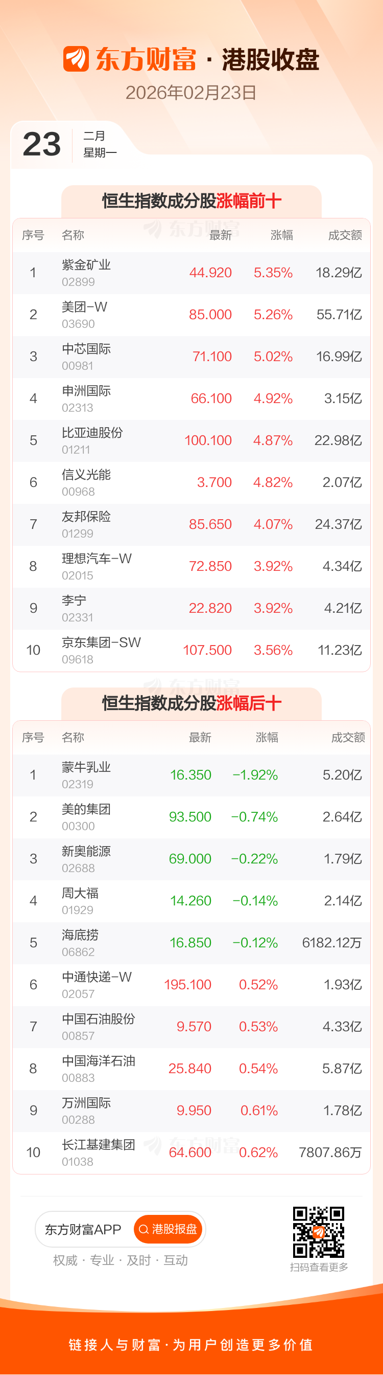 港股2月23日收盘走高,恒生指数收报27081.91点,涨668.56点,涨幅2.53%;恒生科技指数收报5385.35点,涨173.85点,涨幅3.34%。恒生指数成分股中紫金矿业、美团-W、中芯国际涨幅居前,蒙牛乳业、美的集团、新奥能源跌幅靠前。恒生科技指数成分股中蔚来-SW、美团-W、中芯国际涨幅居前,美的集团、地平线机器人-W、阿里健康跌幅靠前。