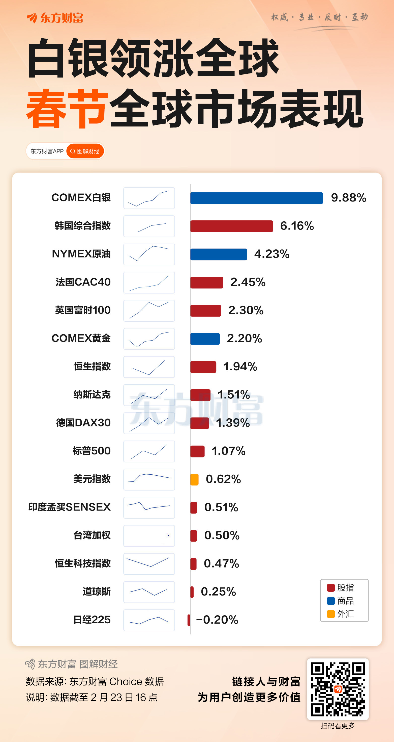 大宗商品方面,春节假期,贵金属与能源品联袂上演强势行情。2月15日至2月22日,伦敦银现区间涨幅达9.42%,COMEX白银上涨8.47%;伦敦金现上涨1.37%,COMEX黄金上涨1.66%;ICE布油区间涨幅5.62%,NYMEX WTI原油上涨5.57%。2月23日早盘,金银继续双双拉升。