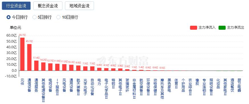 行业资金方面,截至收盘,元件、通信设备、通信服务等净流入排名靠前,其中元件净流入56.66亿。